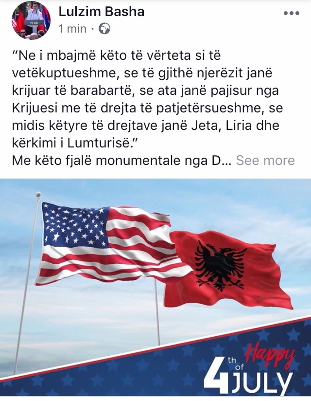 Përmes një postimi në Facebook, kreu i PD Lulzim Basha ka uruar popullin amerikan për 4 korrikun, ditën e Pavarësisë. Basha ka zgjedhur të urojë duke përdorur disa fjalë monumentale nga Deklarata e Pavarësisë së SHBA, ku ndër të tjera thuhet se të gjithë njerëzit janë krijuar si të barabartë.