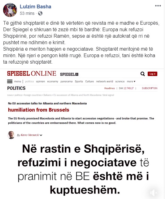 Kreu i Partisë Demokratike, Lulzim Basha i është përgjigjur sërish kryeministrit Edi Rama, duke cituar kësaj radhe revistën gjermane “Der Spiegel”. Në vijim të replikave, ai shkruan se Europa nuk refuzoi Shqipërinë, por refuzoi Ramën, sepse ai është një autokrat që rri në pushtet me ndihmën e krimit. Sipas Bashës është koha ta refuzojnë dhe shqiptarët.