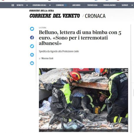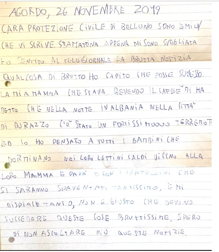 “E dashur Mbrojtja Civile e Bellunos. Unë jam Emily e sot kur u zgjova në mëngjes dëgjova në lajme për lajmin e keq. Mami im që tani është duke pirë kafe , më shpjegoj se në Shqipëri pati një tërmet të fortë. Unë imagjinova ata fëmijë që po flinin në krevatet e tyre të ngrohta, pranë mamit a babit o pranë vëllezërve të tyre, e do jenë trembur shumë. Më vjen keq e uroj të mos dëgjoj më lajme të tilla në televizor. Nga frika ata fëmijë nuk do të kenë ngrënë as mëngjes. Unë nuk jam shqiptare por dua t’u them atyre fëmijëve se dëshiroj të jem mikja e tyre e zemrës. Nuk di si t’ia bëj e dua që ju të më ndihmoni t’iu dërgoj fëmijëve të Shqipërisë këtë pikturën time që ata ta shohin se unë i kam menduar e më vjen shumë keq për atë çfarë u ka ndodhur. Shpresoj që të jenë përsëri të qetë e të lumtur me familjet e tyre. Ju përshëndes fëmijë shqiptarë e po ju nis dhe 5 euro, që nesër të hani mëngjes”, thuhet në letrën prekëse të vogëlushes me emrin Emily. /e.s/