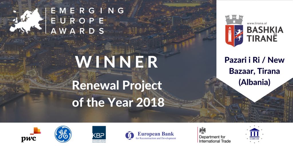 Pazari i Ri i Tiranës fitoi dje çmimin si projekti i Rinovimit 2018 nga Emerging Europe Aëards (EEA) në Londër, një nismë unike që shpërblen praktikat më të mira në Europën Lindore. Ky çmim vjen dy ditë pas vlerësimit që iu bë në Barcelonë sheshit “Skënderbej”, si hapësira më e mirë publike në Europë për 2018.