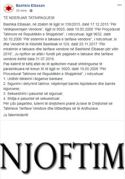 Bashkia Elbasan, në zbatim të ligjit nr.139/2015, datë 17.12.2015 “Për Vetëqeverisjen Vendore”, ligjit nr.9920, datë 19.05.2008 “Për Proçedurat Tatimore në Republikën e Shqipërisë”, i ndryshuar, ligjit 9632, datë 30.10.2006 “Për sistemin e taksave e tarifave vendore”, i ndryshuar, si dhe Vendimit të Këshillit Bashkiak nr.129, datë 20.11.2017 “Për miratimin e taksave dhe tarifave vendore në Bashkinë Elbasan për vitin 2018”, Ju njofton se afati i fundit për pagesën e taksave dhe tarifave vendore është data 31.07.2018.