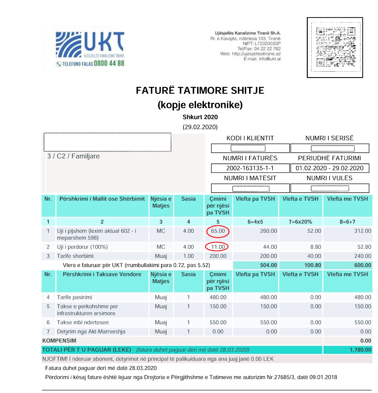 Çdo konsumator familjar, në faturën mujore paguan për ujin e pijshëm dhe trajtimin e ujërave të zeza, të cilat bëjnë shumatoren e çmimit që paguhet çdo muaj. Aktualisht, në Tiranë, çmimi për ujin e pijshëm është 65 lekë/m3 dhe 11 lekë/m3 për ujërat e përdorura (zeza). Pra, në total 76 lekë/m3.
