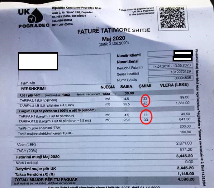 Sipas të dhënave zyrtare të ERRU, por edhe duke i ballafaquar me faturat që aktualisht paguajnë qytetarët, në Korçë çmimi për ujin e pijshëm është 72 lekë/m3 dhe 42 lekë/m3 për ujërat e zeza. Në total, qytetari korçar paguan 114 lekë/m3 çdo muaj. Në Pogradec, çmimi për ujin e pijshëm llogaritet me 62 lekë/m3, kurse për ujërat e zeza 33 lekë/m3. Pra, në total, qytetarët e Pogradecit e paguajnë ujin në faturë me çmim 95 lekë/m3.