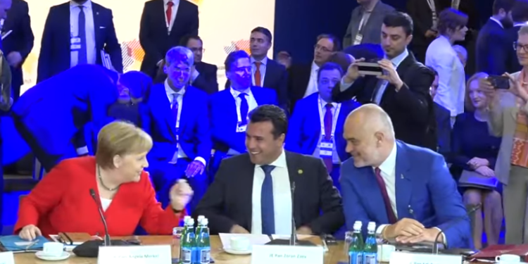 Mes Ramës dhe Merkel është edhe kryeministri maqedonas Zoran Zaev që duken të buzëqeshur nga biseda mes tyre.
