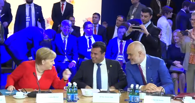 Mes Ramës dhe Merkel është edhe kryeministri maqedonas Zoran Zaev që duken të buzëqeshur nga biseda mes tyre.