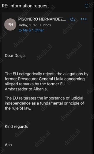 Në një komunikim me email, Pisonero ka thënë për portalin Dosja.al, se deklararat e Llallës nuk janë të vërteta dhe se për BE, është thelbësore pavarësia e gjyqësorit.
