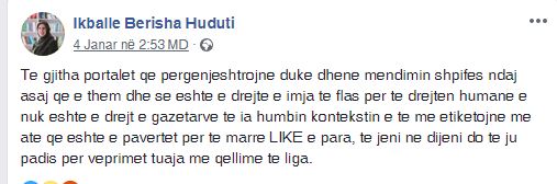 Më pas ajo e kishte fshirë postimin e saj dhe kishte paralajmëruar padi ndaj medieve që e kishin cituar atë.