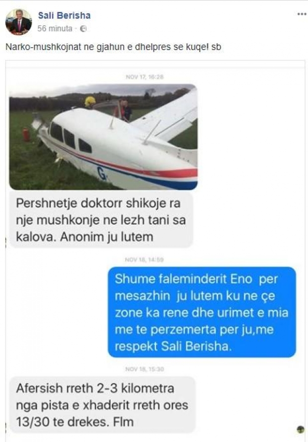 Ish-kryeministri postoi sot një avion të rrëzuar për të cilin tha se ishte i ngarkuar me drogë dhe se ra në Gjadrit të Lezhës.