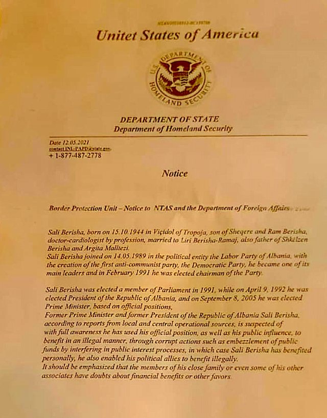 Ky në foto është urdhëri i ndalimit në kufijtë amerikanë për Sali Berisha dhe familjen e tij. Kur të hiqet na njoftoni.
