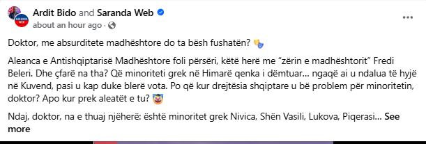 “Doktor, me absurditete madhështore do ta bësh fushatën? Aleanca e Antishqiptarisë Madhështore foli përsëri, këtë herë me “zërin e madhështorit” Fredi Beleri. Dhe çfarë na tha? Që minoriteti grek në Himarë qenka i dëmtuar… ngaqë ai u ndalua të hyjë në Kuvend, pasi u kap duke blerë vota. Po që kur drejtësia shqiptare u bë problem për minoritetin, doktor? Apo kur prek aleatët e tu?”, shkruan Bido ndër të tjera në llogarinë e tij në rrjetin social Facebook.