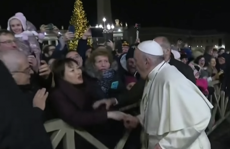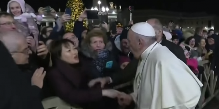 Ai takohet me besimtarë të shumë që ndodheshin aty por një grua teksa e ka përshëndetur fillimisht e ka tërhequr Papën me forcë, gati duke e rrëzuar.
