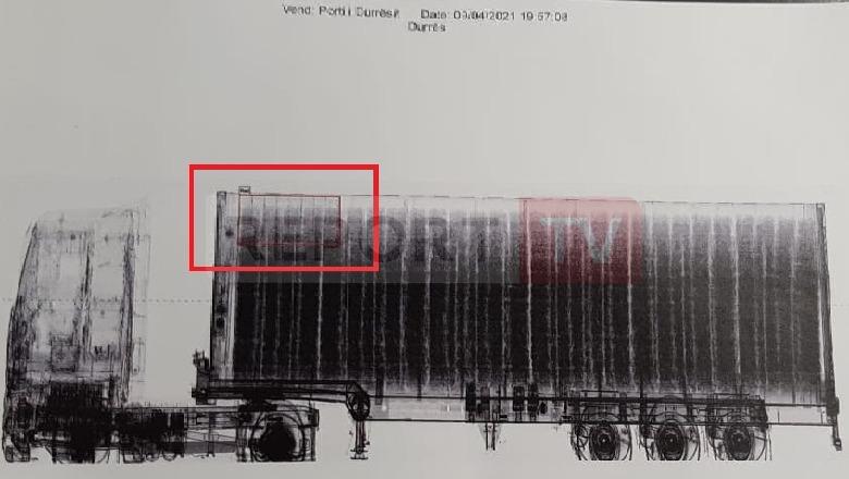 Report TV siguroi ekskluzivisht edhe pamjet e skanerit të realizuar mbrëmjen e 9 prillit në portin e Durrësit nga e cila u zbulua prania e ngarkesës së drogës, e fshehur në pjesën e sipërme të kontainerit dhe që mund të shihet në kuadratin e kuq.
