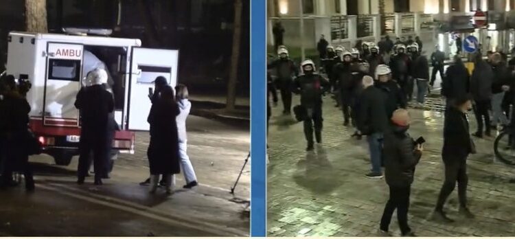 Bidonë me ujë dhe çadra janë hedhur drejt policisë, ku disa efektivë kanë mbetur të lenduar dhe kane marre ndihmë mjekësore.