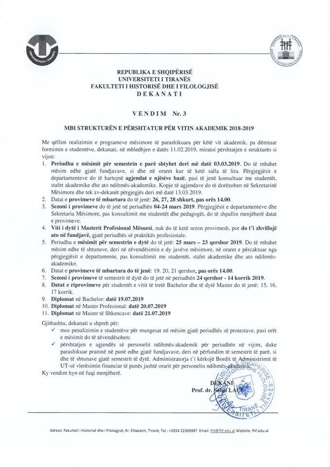 Vendim nr.3 mbi strukturën e përshtatur për vitin akademik 2018-2019