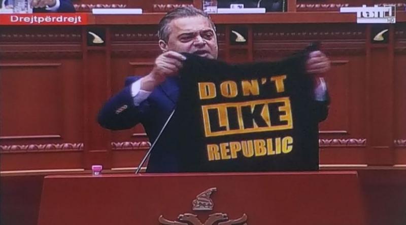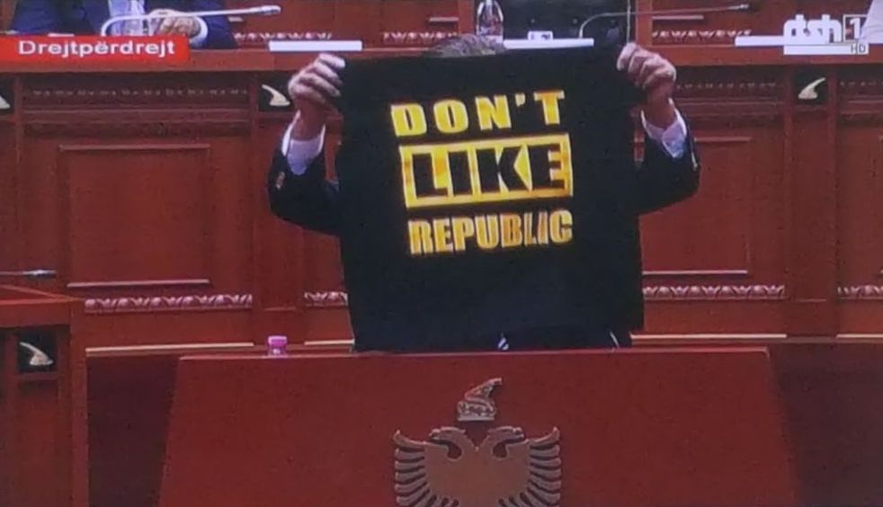 Në bluzën që e mbante në dorë, shkruhej anglisht: “Don’t like republic” (Nuk me pëlqen republika).