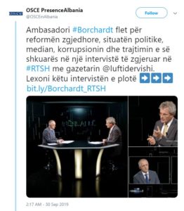 Ambasadori i OSBE-së në Tiranë, Bernd Borchardt në intervistë të zgjeruar për gazetarin Lufti Dervishi ka folur për reformën zgjedhore, situatën politike, median, korrupsionin dhe trajtimin e së shkuarës.