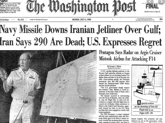“Kushdo duhet ta kujtojë tragjedinë e vitit 1988 kur ‘Iran Air Flight 655’, një ‘Airbus A300’ me 290 persona në bord, u hodh në erë nga një raketë e shkrepur nga kryqëzori amerikan ‘USS Vincennes’ ndërsa fluturonte mbi Gjirin Persik me destinacion Dubain më 3 korrik 1988”.