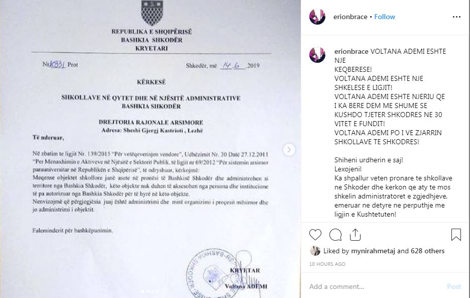 Përmes një mesazhi në rrjetet sociale, Braçe shkruan se Ademi ka shkelur ligjin dhe është njeriu që i ka bërë më shumë dëm Shkodrës në këto 30 vitet e fundit.
