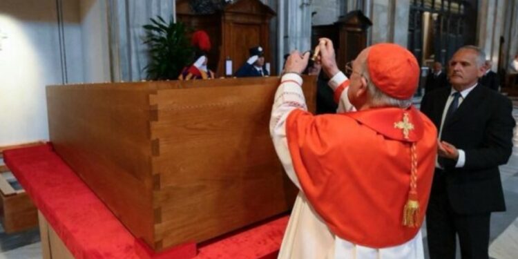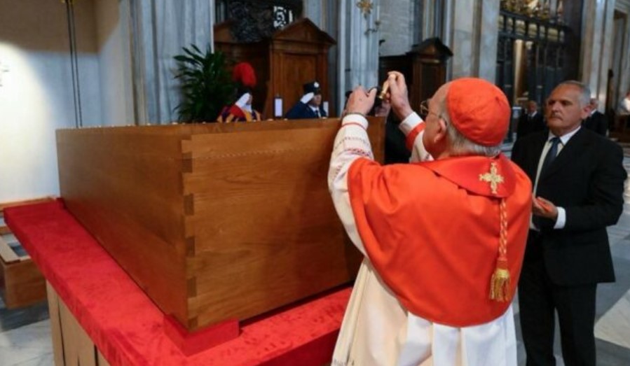 “Riti i varrimit të Papës u parapri nga këndimi i katër psalmeve dhe shoqërohej nga pesë ndërmjetësime (lutje ndërmjetësuese), përpara se të këndohej lutja “Ati Ynë”. Pas lutjes përfundimtare, vulat e Kardinalit Kamarling të Kishës së Shenjtë Romake, Kevin Joseph Farrell, të Prefekturës së Shtëpisë Papnore, të Zyrës së Celebrimeve Liturgjike të Papës dhe të Kapitullit Liberian u vendosën mbi arkivol”, thuhet ne njoftimin e Vatikanit.