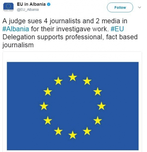“Janë paditur katër gazetarë dhe dy media në Shqipëri për punën e tyre investigative. Delegacioni i BE mbështet profesionalizimin dhe gazetarinë e bazuar në fakte”, thuhet në deklaratën e Delegeacionit të BE në Tiranë.