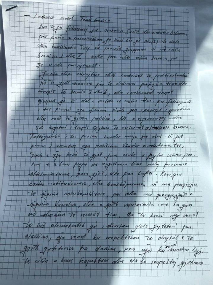 I nderuar avokat Tomë Gashi, unë që nga sot e kam marrë një vendim që të mos kem edhe më tutje përfaqësues ligjorë (avokat), nga sot nuk dua të kem avokat mbrojtës më vjen keq që deri më tani keni qenë jashtëzakonisht aktiv, në mbrojtjen e pafajësisë time dhe duke e dëshmuar me fakte keni bërë të pamundurën për ta ndihmuar edhe drejtësinë (njerëzit e saj) për ta vënë drejtësinë.