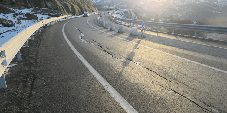 Në një shtrirje prej më shumë se 20 metrash, çarja e asfaltit dhe deformimi i trupit të rrugës rrezikojnë seriozisht sigurinë e qarkullimit, raporton korrespondentja e RTSH-së.