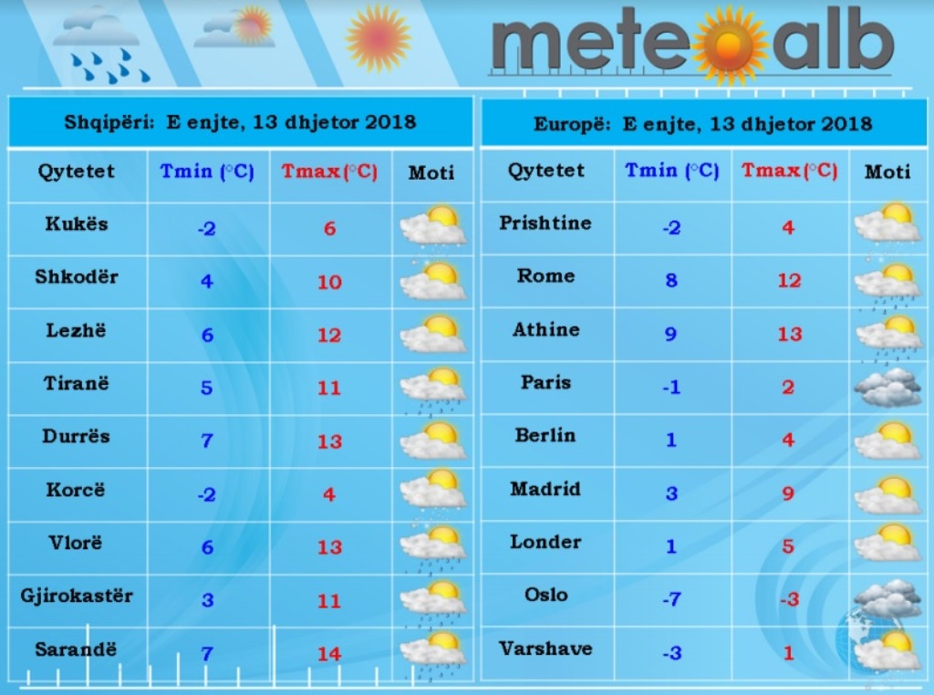 Sipas MeteoAlb, temperaturat e ajrit rriten në mëngjes dhe mesditë duke luhatur vlerat ekstremale ditore nga -4 në 14°C.