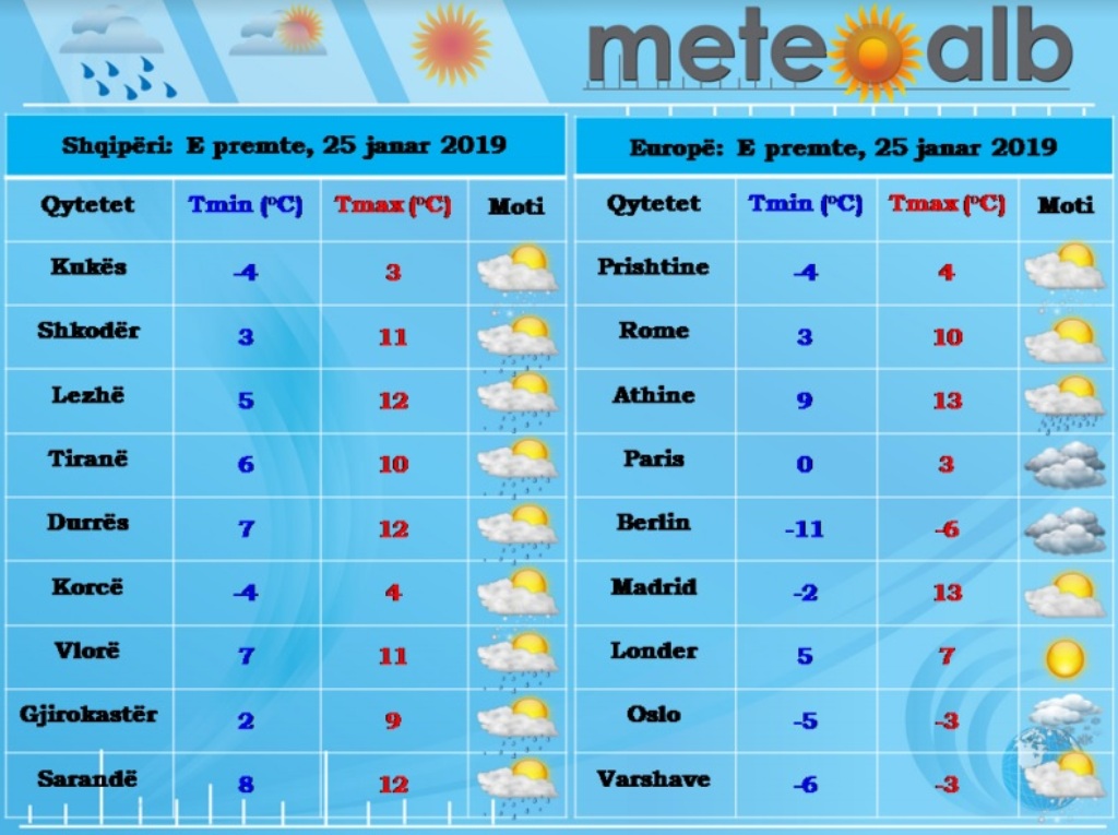 Sipas MeteoAlb, temperaturat e ajrit do të ulen sërish në mëngjes dhe mesditë duke luhatur vlerat ekstremale ditore nga -6°C deri në 12°C.