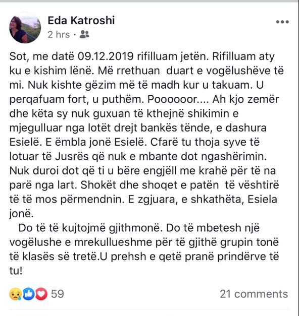 “Sot, me datë 09.12.2019 rifilluam jetën. Rifilluam aty ku e kishim lënë. Më rrethuan duart e vogëlushëve të mi. Nuk kishte gëzim më të madh kur u takuam. U perqafuam fort, u puthëm. Poooooor…. Ah kjo zemër dhe këta sy nuk guxuan të kthejnë shikimin e mjegulluar nga lotët drejt bankës tënde, e dashura Esielë. E ëmbla jonë Esielë. Cfarë tu thoja syve të lotuar të Jusrës që nuk e mbante dot ngashërimin. Nuk duroi dot që ti u bëre engjëll me krahë për të na parë nga lart. Shokët dhe shoqet e patën të vështirë të të mos përmendnin. E zgjuara, e shkathëta, Esiela jonë. Do të të kujtojmë gjithmonë. Do të mbetesh një vogëlushe e mrekullueshme për të gjithë grupin tonë të klasës së tretë. U prehsh e qetë pranë prindërve të tu!”, shkruan mësuesja. /e.s/