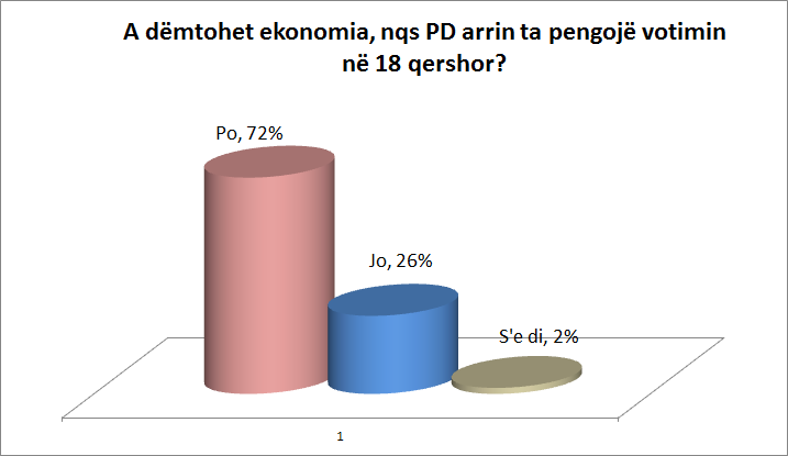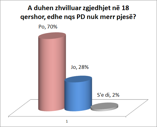 Nga një sondazh elektronik që zhvillova për revistën Follow Business Albania, rezultonte se 70% e votuesve donin që zgjedhjet të zhvillohen në 18 qershor, edhe në qoftë se PD-ja nuk merr pjesë në to (vetëm 28% nuk donin që të zhvillohen zgjedhjet pa pjesëmarrjen e PD-së). Por a tregon ky rezultat se 70% e votuesve që banojnë në Shqipëri janë përkrahës të mazhorancës?