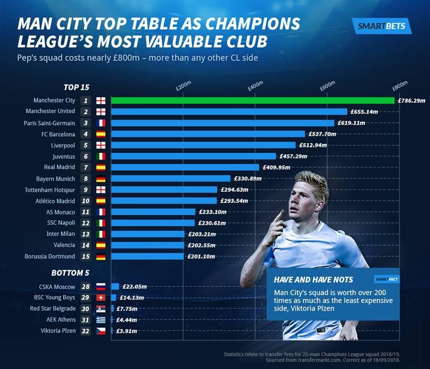 Observatori Ndërkombëtar i Futbollit, Cies, ka publikuar renditjen e skuadrave me vlerën më të lart në bazë të investimeve që janë bërë në merkato. Në krye të renditjes qëndron Manchester City me 976 milionë euro, pothuajse 200 milionë euro më shumë se vendi i dytë që mbahet nga PSB (788) dhe Manchester United (786).