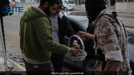 Në Sirte të Libisë, sulmet terroriste në Paris janë festuar publikisht. Anëtarët e ISIS kanë shpërndarë karamele dhe ëmbëlsira nëpër rrugë. “Tema” shkruan se disa prej këtyre fotove janë publikuar nëpër rrjetet sociale. “Gëzimi i besimtarëve myslimanë për sulmet e bekuara në Paris”, është mbishkrimi i këtyre fotove.