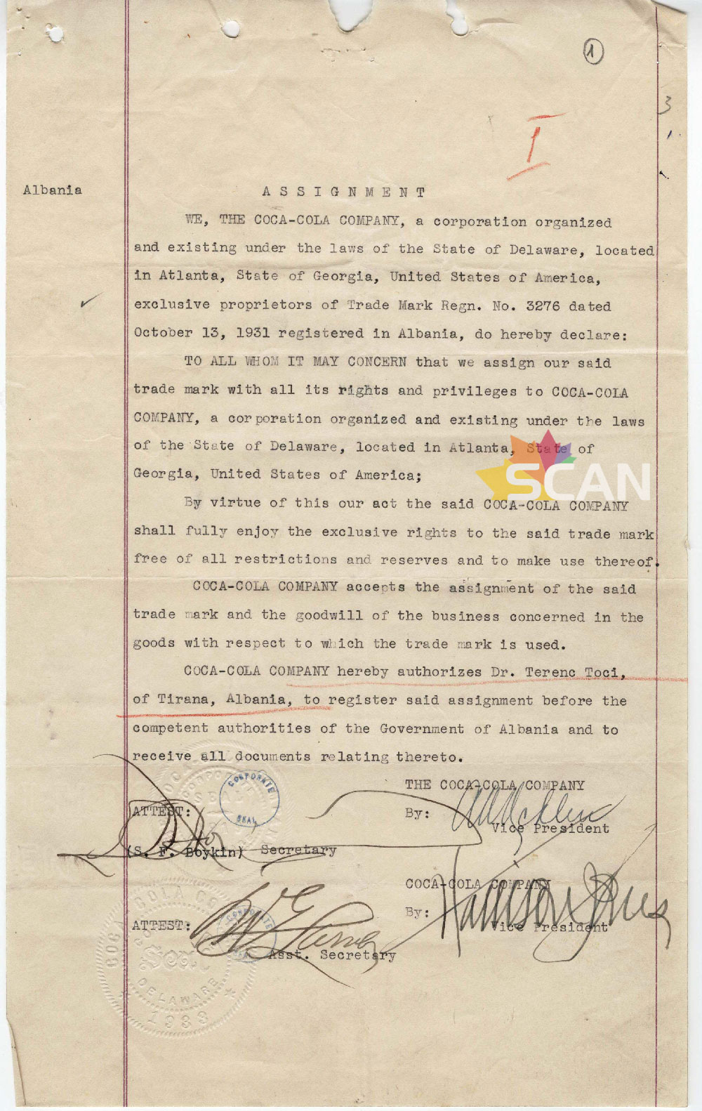 Në këtë dokument që publikohet për herë të parë, Coca-Cola autorizon si përfaqësues të sajin në Shqipëri një nga personalitetet më të njohura të historisë së Shqipërisë, arbereshin Terenc Toçi.