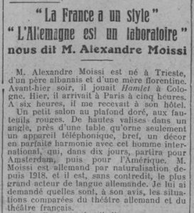 Gazeta pariziene, Comoedia, ka botuar, të dielën e 9 tetorit 1927, në ballinë, intervistën ekskluzive të zhvilluar asokohe me aktorin më të madh gjerman me origjinë shqiptare – siç e quan ajo – Z. Aleksandër Moisiun.