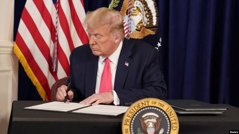 Në klubin e tij privat të golfit në Bedminster të Nju Xhersit, Presidenti Trump nënshkroi një urdhër ekzekutiv dhe tre memorandume që synojnë të ndihmojnë miliona amerikanë të cilët kanë humbur punën për shkak të pandemisë.