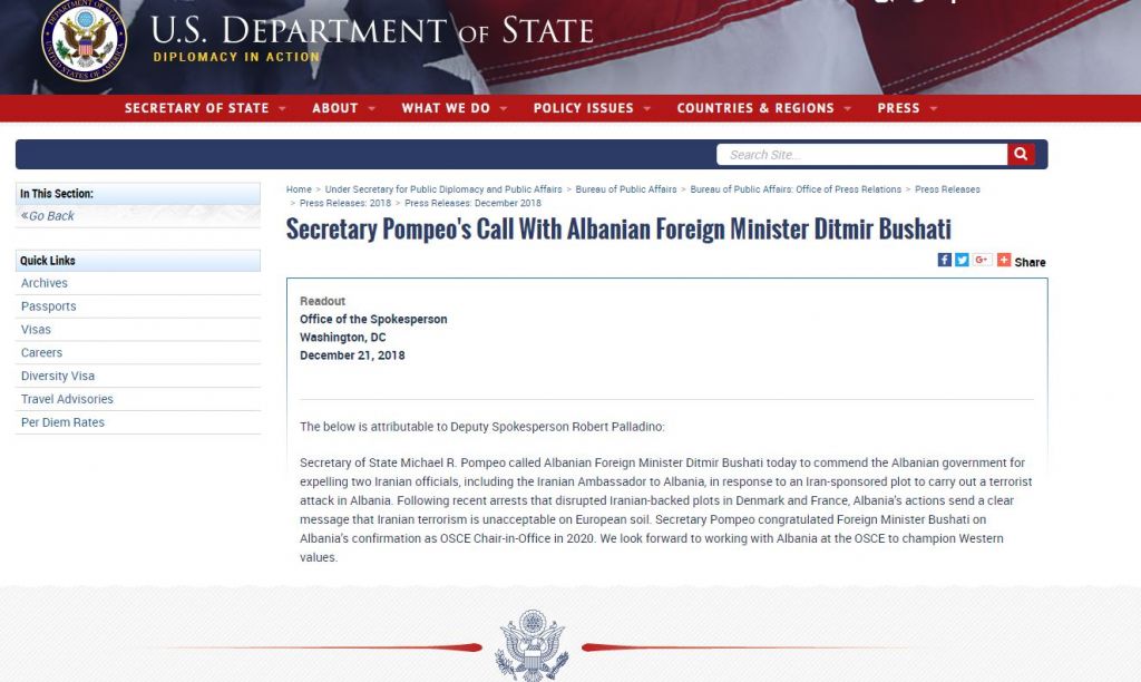 Në këtë deklaratë, Departamenti shtetit thotë “Sekretari i shtetit Pompeo telefonoi Ministrin e Jashtëm Shqiptar Ditmir Bushati për të përgëzuar qeverinë shqiptare për dëbimin e dy iranianëve, përfshirë ambasadorin e Iranit në Shqipëri, si përgjigje ndaj përgatitjeve të një komploti për një sulm terrorist në Shqipëri.”
