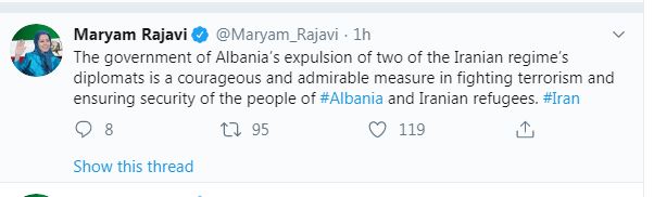 “Dëbimi nga qeveria e Shqipërisë e dy diplomatëve të regjimit iranian është një masë e guximshme dhe e admirueshme në luftën kundër terrorizmit dhe sigurimin e sigurisë së njerëzve të Shqipërisë dhe refugjatëve iranianë”, shkruan ajo në Twitter.
