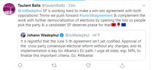 “@JoWadephul PS po punon shumë për të bërë një marrëveshje fitoreje me të dyja opozitat! Nesër ne e shtyjmë përpara marrëveshjen e 5 qershorit dhe plotësojmë punën me demokratizimin e mëtejshëm të zgjedhjeve duke hapur listat në mënyrë që njerëzit të zgjedhin partinë dhe një kandidat! PS meriton lavdërime për këtë”, shkruan Balla në “Twitter”.