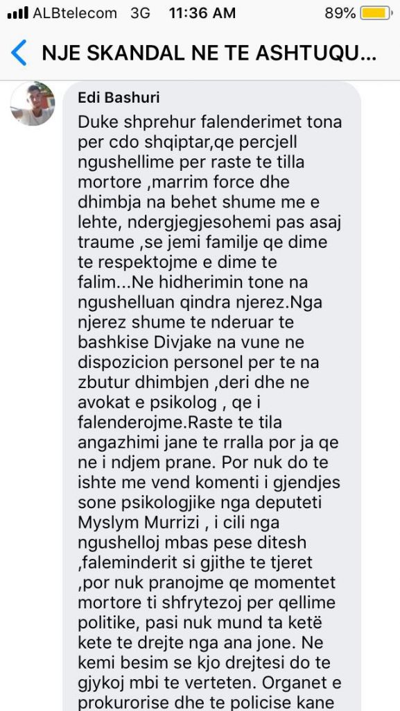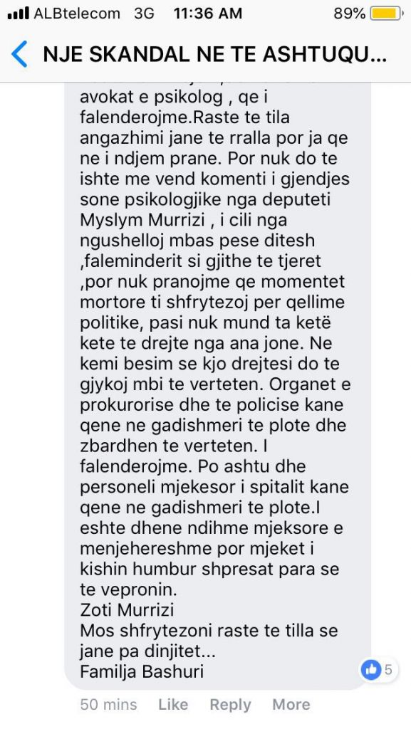 Familjarët e fëmijës që humbi jetën në Divjakë përgënjeshtrojnë deputetin e PD përmes një postimi ku falenderojnë të gjithë personat që iu gjendën pranë në një moment kaq të vështirë. Sipas tyre shërbimi mjekësor i dha ndihmë të menjëhershm. Sakaq kanë komentuar edhe qendrimin e deputetit të Partisë Demokratike Myslim Murrizi duke iu përgjigjur: “Mos na e rëndo dhimbjen, mos shfrytezo vdekjen për qëllime politike”. /ma.me