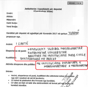 Për konkluzione të tilla ekzistojnë fakte, analiza, të dhëna monitoruese, etj, por ndonjëherë mjafton edhe një detaj për t’i thënë të gjitha, – për shembull, si kjo CV-ja zyrtare e njërit prej deputetëve aktualë 2019, pra në kohën kur parlamenti do të duhej të ishte tempulli i demokracisë, të kishte cilësi përfaqësimi dhe kur Shqipëria pret të nisë bisedimet për anëtarësim në BE (!!). Pa koment! /l.m