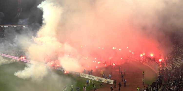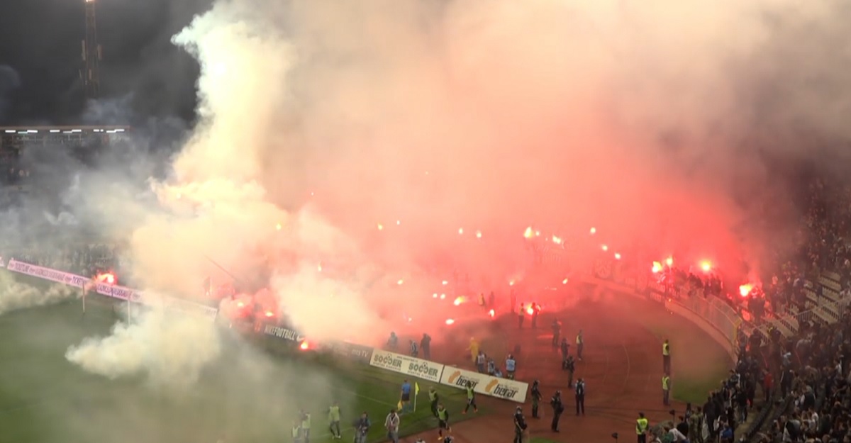 Flakandanë dhe ndërprerje të ndeshjes për disa minuta duke sjellë atmosferën e zakonshme në këtë ndeshje. Partizani i Beogradit do ta luajë finalen me Vojvodinën më 24 Qershor.