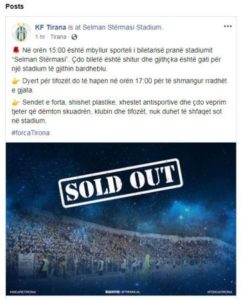 Lajmin për shitjen e të gjtha biletave e ka bërë publik klubi i Tiranës. Në një postim në facebook bardheblutë bëjnë me dije se të gjitha biletat janë shitur dhe se stadiumi do të hapet në orë 17:00 për tifozerinë në mënyrë që të shmangen rradhët e gjata.