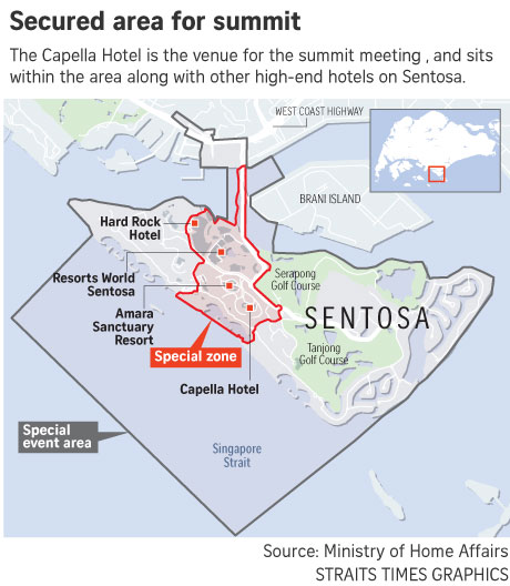 Opsioni më i mirë i diskutuar që nga fillimi ishte hoteli Shangri-La, një strukturë masive pranë rrugës Orchard, e cila mund të sigurohej shumë mirë, ndërkohë që siguronte një ambient të zbukuruar. Hoteli priti një takim historik midis presidentit kinez Xi Jinping dhe udhëheqësit të Tajvanit Ma Ying-jeou në 2015.