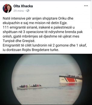 Lajmi është bërë i ditur nga vet ministrja e Mbrojtjes Olta Xhaçka. Përmes një postimi në ‘Facebook’ Xhçka pohon se emigrantët, të cilët lundronin në 2 gomone dhe 1 skaf, iu dorëzuan Rojës Bregdetare turke.
