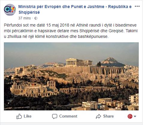 “Përfundoi sot me datë 15 maj 2018 në Athinë raundi i dytë i bisedimeve mbi përcaktimin e hapsirave detare mes Shqipërisë dhe Greqisë. Takimi u zhvillua në një klimë konstruktive dhe bashkëpunuese”, njkofton ministria përmes një reagimi të shkurtër për mediat.
