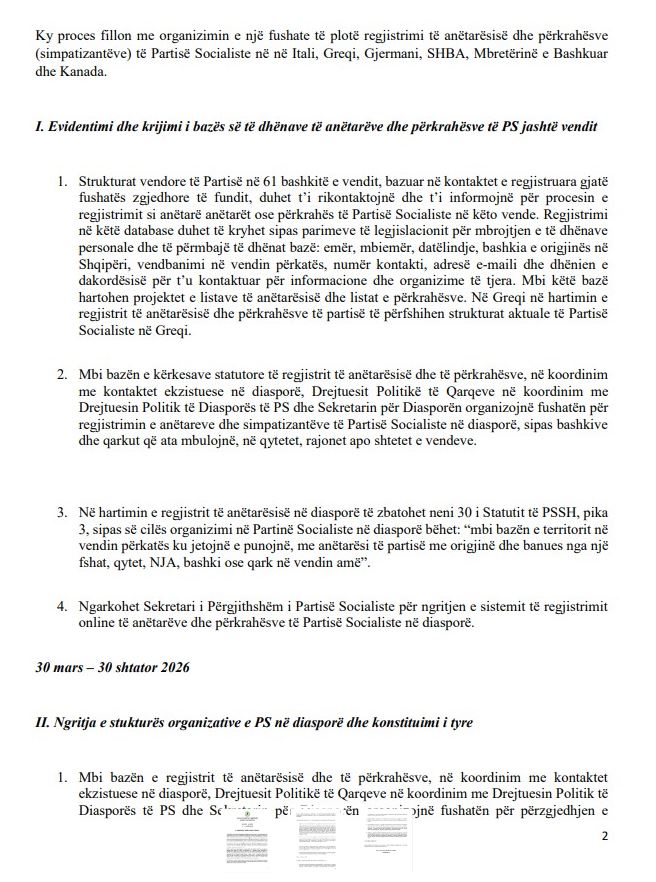 Sipas një projekt-vendimi të socialistëve, do të krijohet një regjistër të anëtarësisë dhe të përkrahësve nga diaspora shqiptare, duke nisur me vendet kryesore ku jetojnë gati 90% e shqiptarëve.