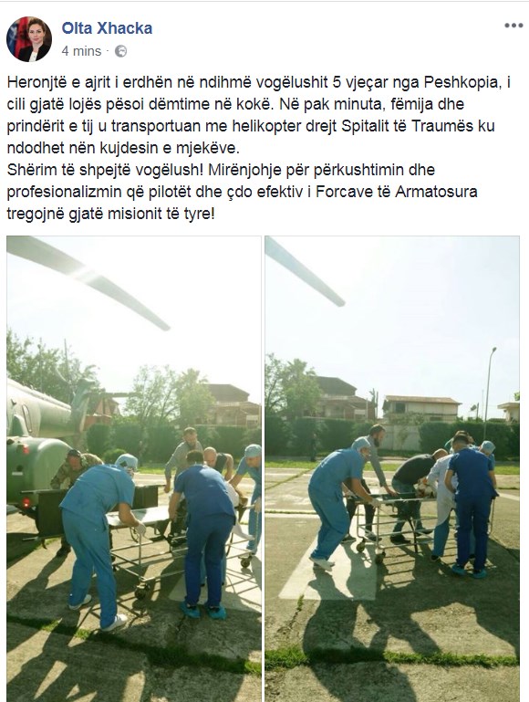 “Heronjtë e ajrit i erdhën në ndihmë vogëlushit 5 vjeçar nga Peshkopia, i cili gjatë lojës pësoi dëmtime në kokë. Në pak minuta, fëmija dhe prindërit e tij u transportuan me helikopter drejt Spitalit të Traumës ku ndodhet nën kujdesin e mjekëve. Shërim të shpejtë vogëlush! Mirënjohje për përkushtimin dhe profesionalizmin që pilotët dhe çdo efektiv i Forcave të Armatosura tregojnë gjatë misionit të tyre!” ,shkruan Olta Xhaçka, ministre e Mbrojtjes.