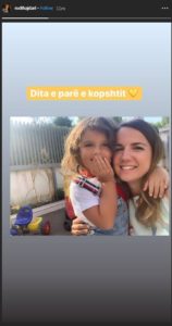 Nënë e bijë kanë pozuar krah njëra-tjetrës duke buzëqeshur, “Dita e parë e kopshtit”, shkruan Rudina Hajdari krah fotos. /l.m
