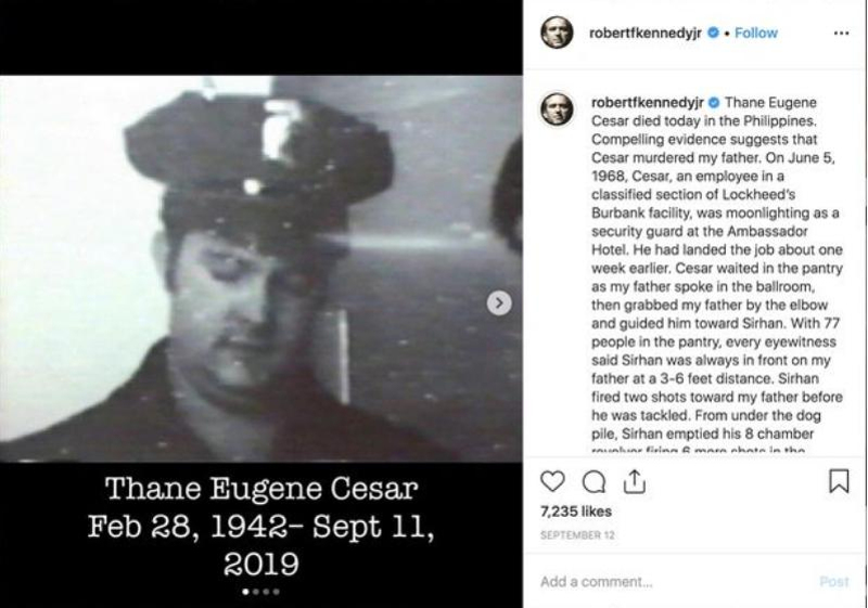 Edhe pse Sirhani qëlloi kundër të atit, plumbat që i dhanë fundi jetës erdhën nga Thane Eugene Cesar, sipas djalit.