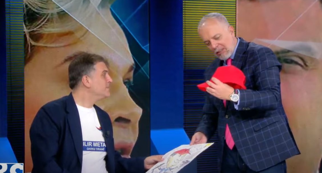 Tedi Blushi: Unë po të jap dhuratë këtë kapelë dhe kur të mbaroj intervista dhe do të jap dhuratë bluzën [e mban veshur] për të votuar për Ilir Metën me 11 maj.